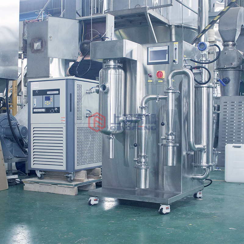 設備主要由:送料系統(tǒng)、加熱系統(tǒng)、霧化系統(tǒng)、噴霧干燥系統(tǒng)、惰性氣體循環(huán)系統(tǒng)、產(chǎn)品回收系統(tǒng)、冷凝系統(tǒng)組成。